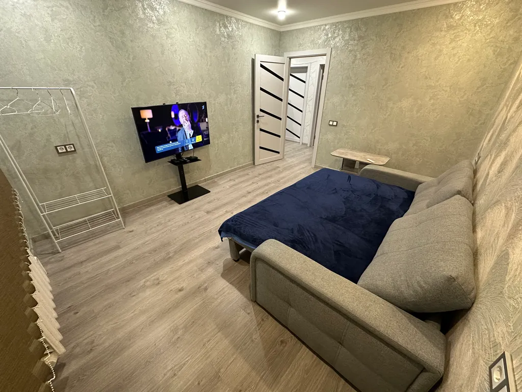 Просторная комната с удобным двуспальным диваном на ортопедическом основании — идеально для полноценного сна. Вечерами можно устраиваться перед большим 50-дюймовым телевизором (ТВ-приставка с 120 каналами). Уют добавляет регулируемый тёплый пол — особенно приятно в прохладные дни. А освещением можно управлять с пульта, создавая нужное настроение.
