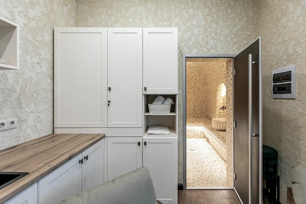 Для истинных ценителей банных традиций имеется баня на дровах – место, где можно по-настоящему расслабиться и восстановить силы. А для тех, кто предпочитает более мягкие процедуры, предусмотрен роскошный турецкий хамам с арома-терапией, где каждая деталь создана для максимального комфорта.