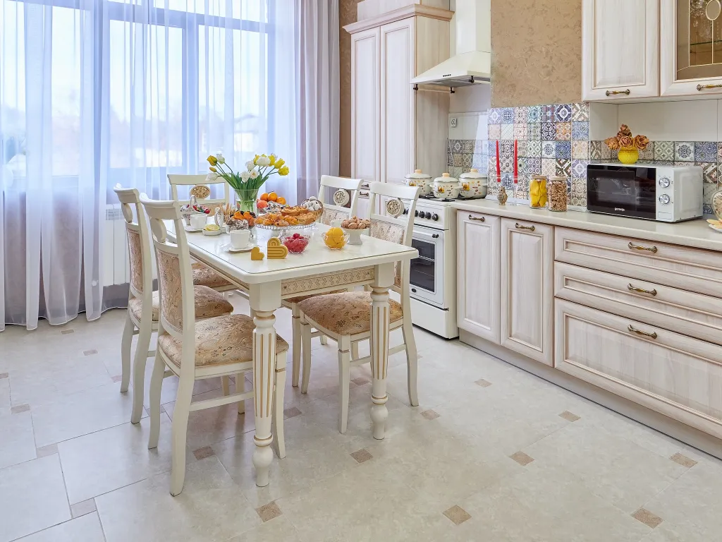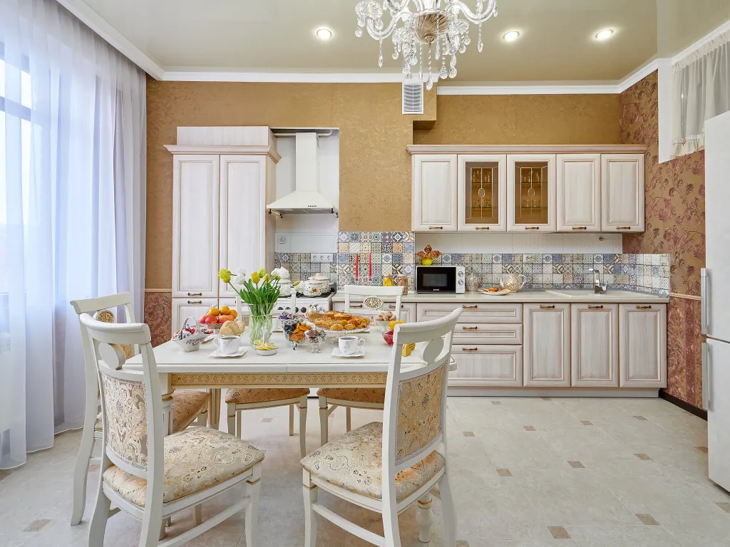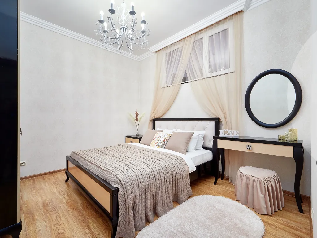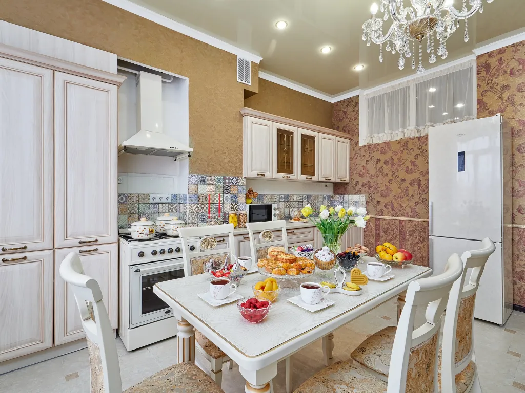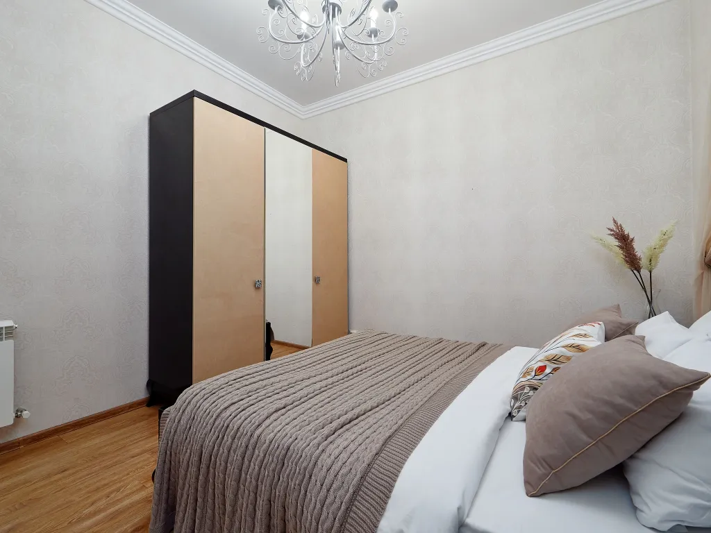 В спальне поставили большую кровать с ортопедическим матрасом, в гостиной — удобный раскладной диван. Кухню оборудовали всей необходимой бытовой техникой и полным комплектом посуды, здесь вам захочется вкусно готовить, кушать и вместе проводить время, играя в настолки, к примеру.