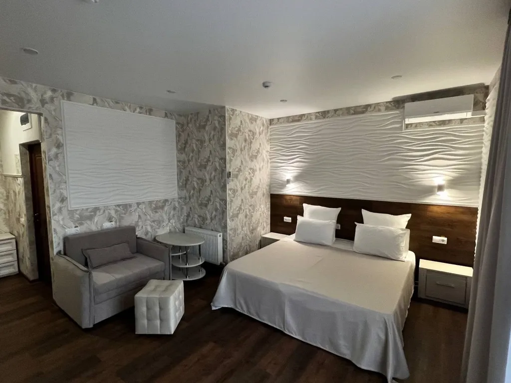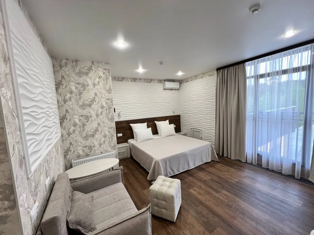 Ортопедический матрас, мягкая мебель, тв, мини-холодильник, кд, сейф, wi-fi, чайник, чашки, чай и кофе, питьевая вода. Французский балкон с панорамным видом на город и горы. Доп. Место – раскладывающееся кресло. Номера расположены в основном корпусе в самом центре города-курорта Кисловодска.