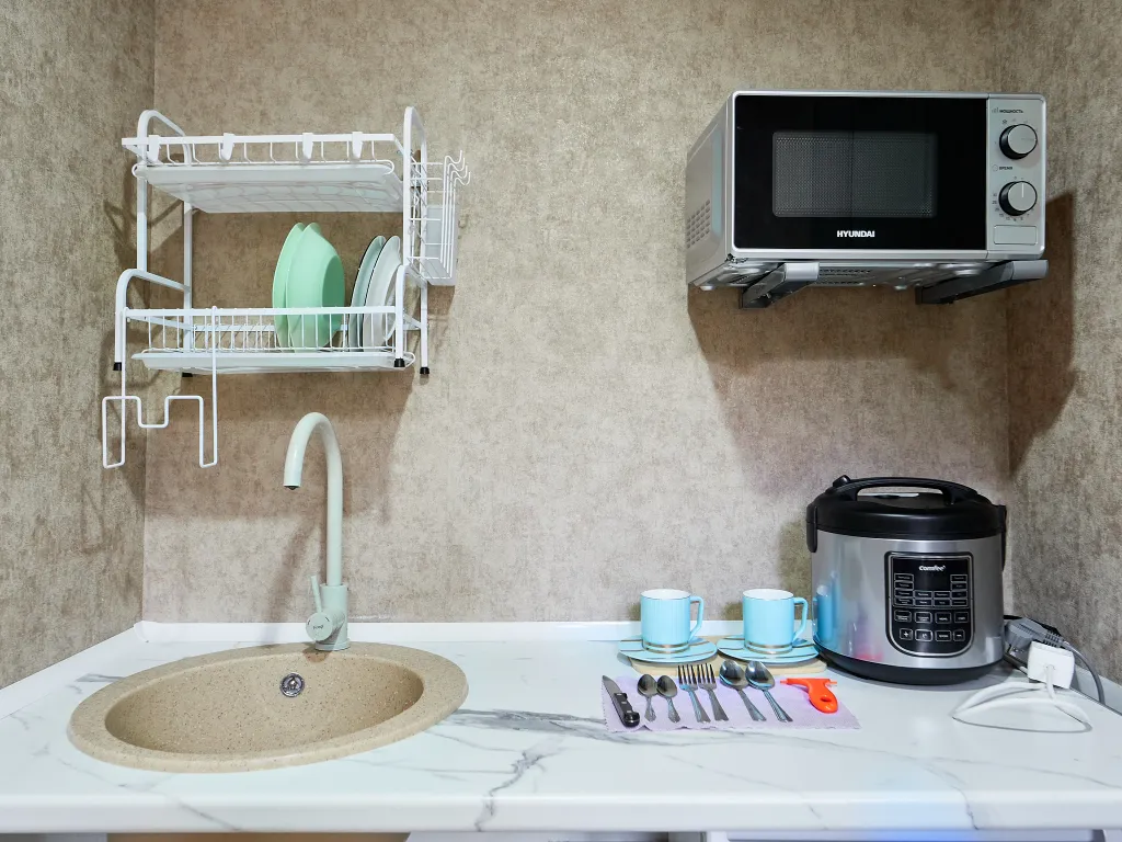 Также вы найдете кухонную зону со всем необходимым для приготовления вашей еды. Мультиварка все приготовит за вас.