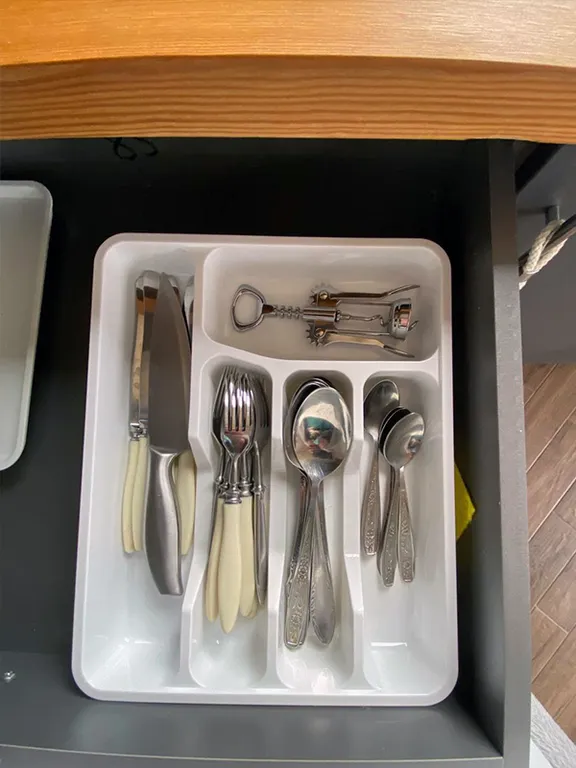 Наполнение кухни: индукционная плита, мини-холодильник, микроволновая печь, стиральная машина, столовые приборы и кухонная утварь для готовки.